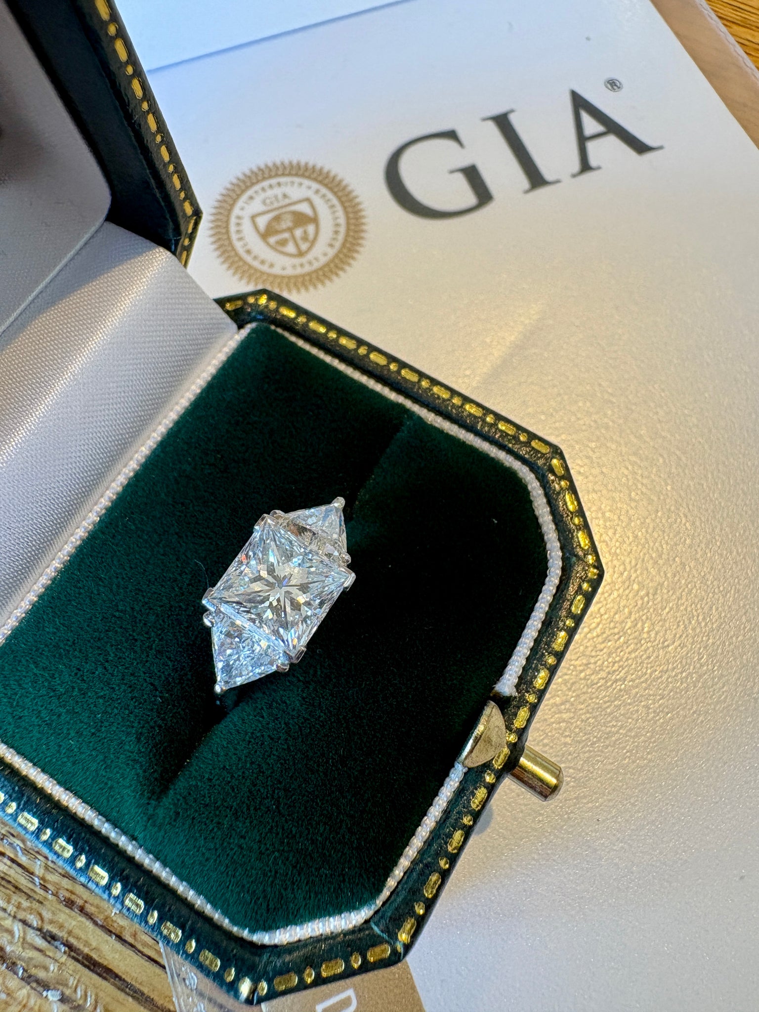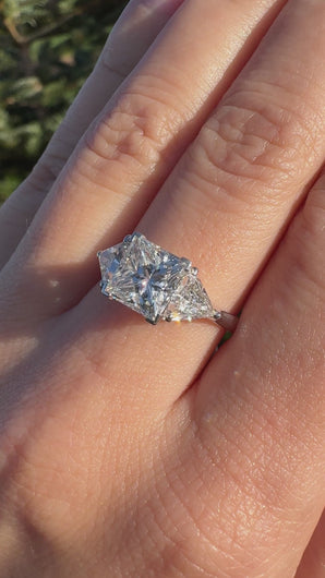 This exquisite 2.16ct Princess Cut Diamond Ring is the perfect symbol of elegance and sophistication. Set in luxurious platinum, this stunning piece features a dazzling central 2.16ct princess cut diamond, complemented by two sparkling 0.5ct trillion cut diamonds on each side.