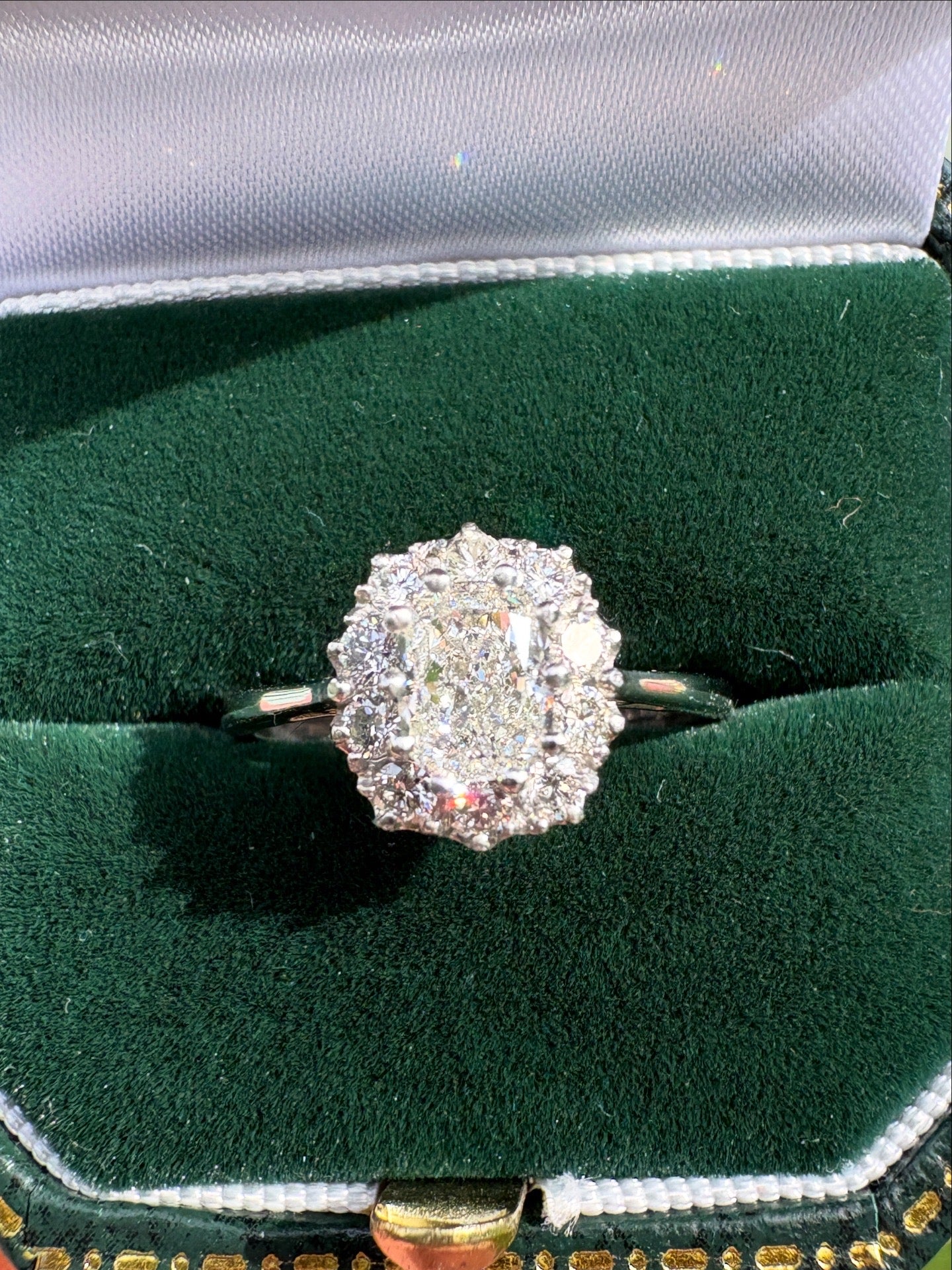 This stunning oval diamond cluster ring features a sparkling 0.70ct oval-cut centre stone, beautifully framed by 0.36ct of surrounding diamonds in a dazzling cluster design. The halo-style cluster enhances the size and radiance of the centre diamond, creating exceptional fire and light from every angle.