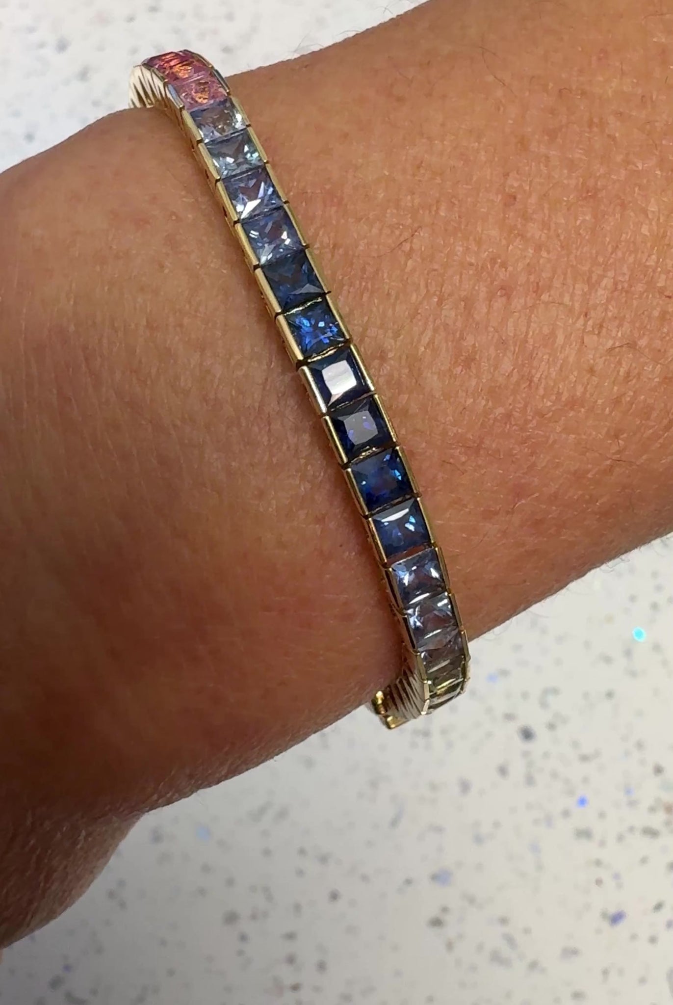 Elevate your elegance with this breathtaking gradient sapphire bracelet. The sapphires cascade from soft pinks to deep blues to glowing yellows and finishing at the clasp with rich greens.
