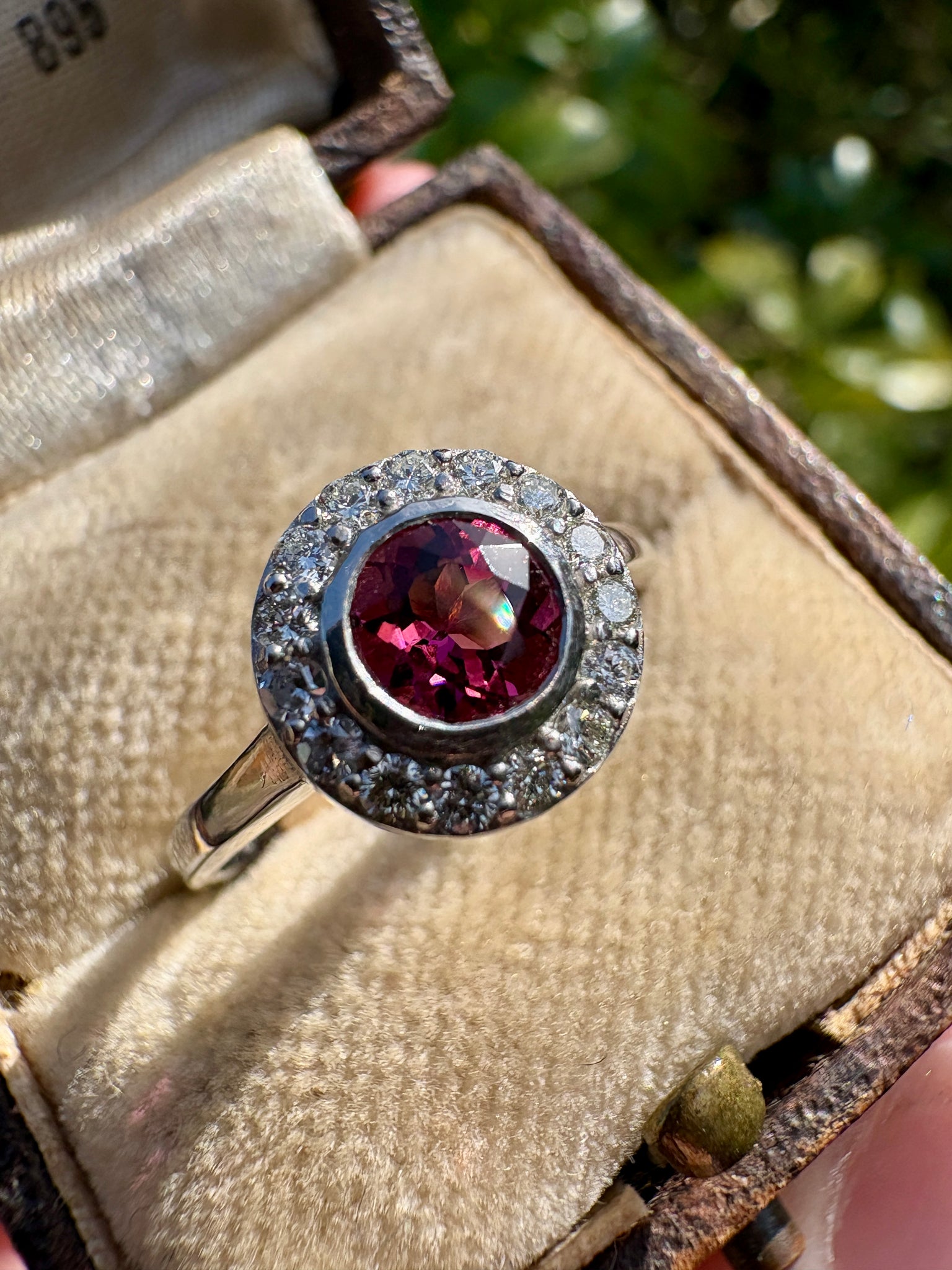 Elegant, vibrant, and timeless, this beautiful ring features a captivating pink tourmaline at its centre, glowing with rich raspberry tones. The oval-cut tourmaline is encircled by a delicate halo of sparkling diamonds, enhancing the gemstone’s colour while adding brilliant light and contrast.