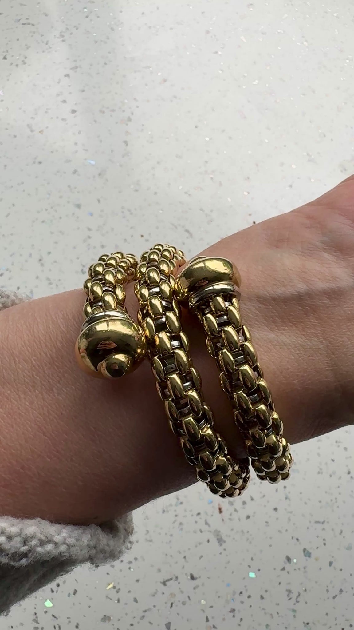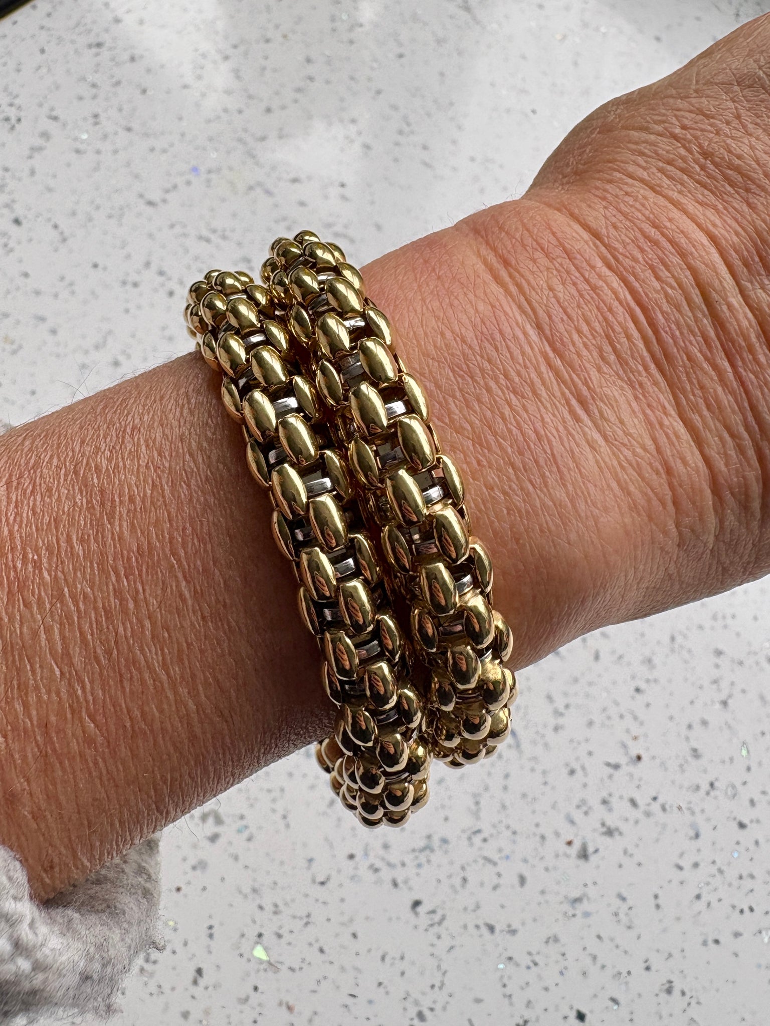 Bold, refined, and effortlessly luxurious, this 18ct gold bracelet is a true statement piece. Crafted in solid 18-carat gold, it features an intricate multi-row woven link design that creates rich texture and dimensional shine from every angle.