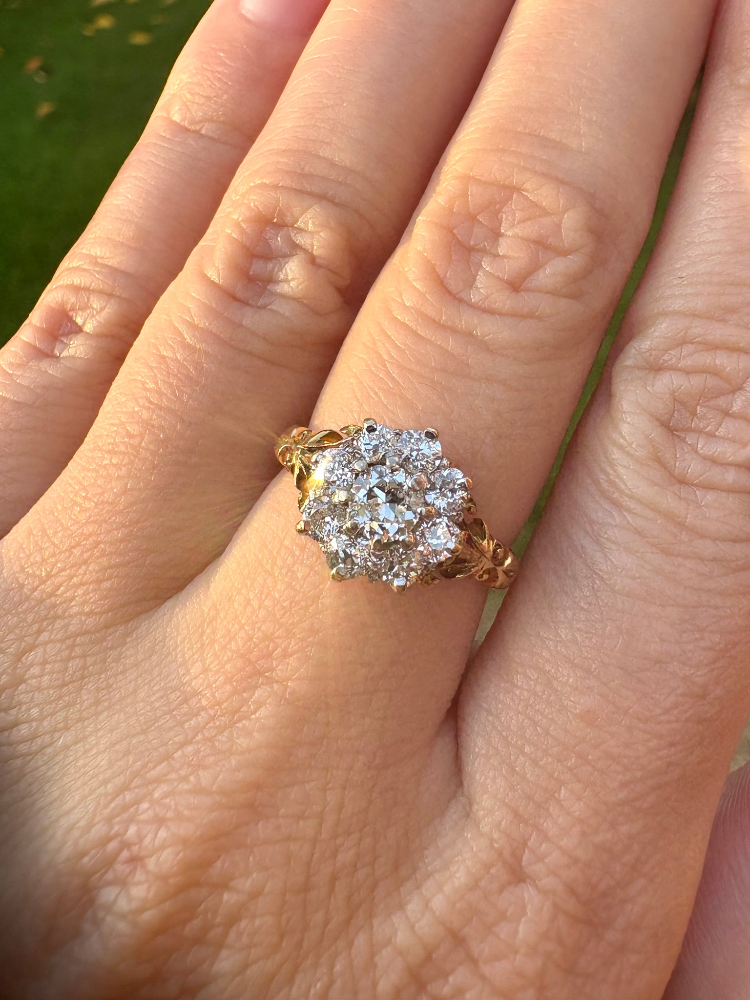 This exquisite old cut diamond cluster ring captures the elegance of a bygone era. Its center is formed from a tightly set constellation of diamonds estimated at 0.90cts and arranged to mimic a blossoming flower. The intricate 18ct gold band, with its sculpted leaf-like details, adds depth, craftsmanship, and warmth to the design. A beautiful piece full of charm and character.