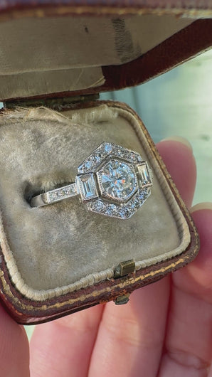 An elegant Art Deco–inspired ring, beautifully crafted in platinum and set with a striking combination of brilliant-cut and baguette-cut diamonds. The carefully balanced diamond arrangement enhances the ring’s clean lines and geometric character, resulting in a timeless yet distinctive design.